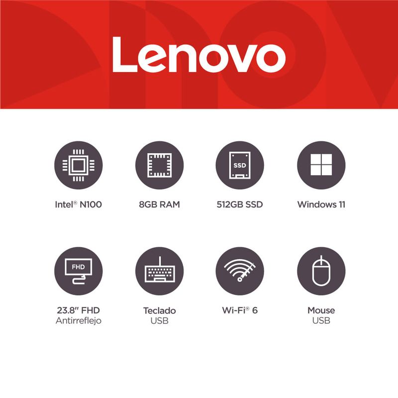 TecnologíaInformaticaComputadores de Escritorio y All in OneComputador AIO Lenovo A100 - Intel N100 - RAM 8 GB - 512 GB SSD - 23.8" FHD - Nube Gris